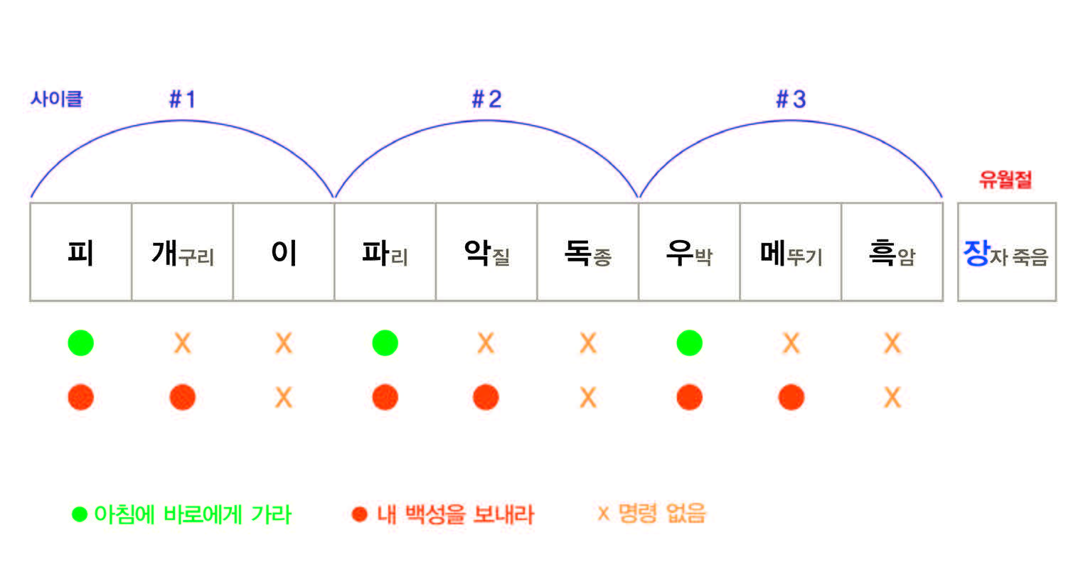 각 사이클의 첫 번째 재앙인 첫 번째, 네 번째, 일곱 번째 재앙 전에는, 하나님께서 모세에게 ‘아침에’ 바로에게 가서 ‘내 백성을 보내라’ 하라고 말씀하셨습니다. 각 사이클의 두 번째 재앙인 두 번째, 다섯 번째, 여덟 번째 재앙 때는 ‘아침에 가라’는 말씀 없이 모세에게 바로에게 가서 ‘내 백성을 보내라’ 하라고 말씀하셨습니다. 각 사이클의 세 번째 재앙인 세 번째, 여섯 번째, 아홉 번째 재앙 때는 다른 말씀 없이 바로 재앙을 내리셨습니다.