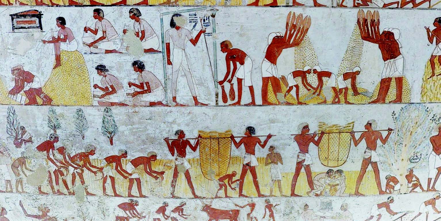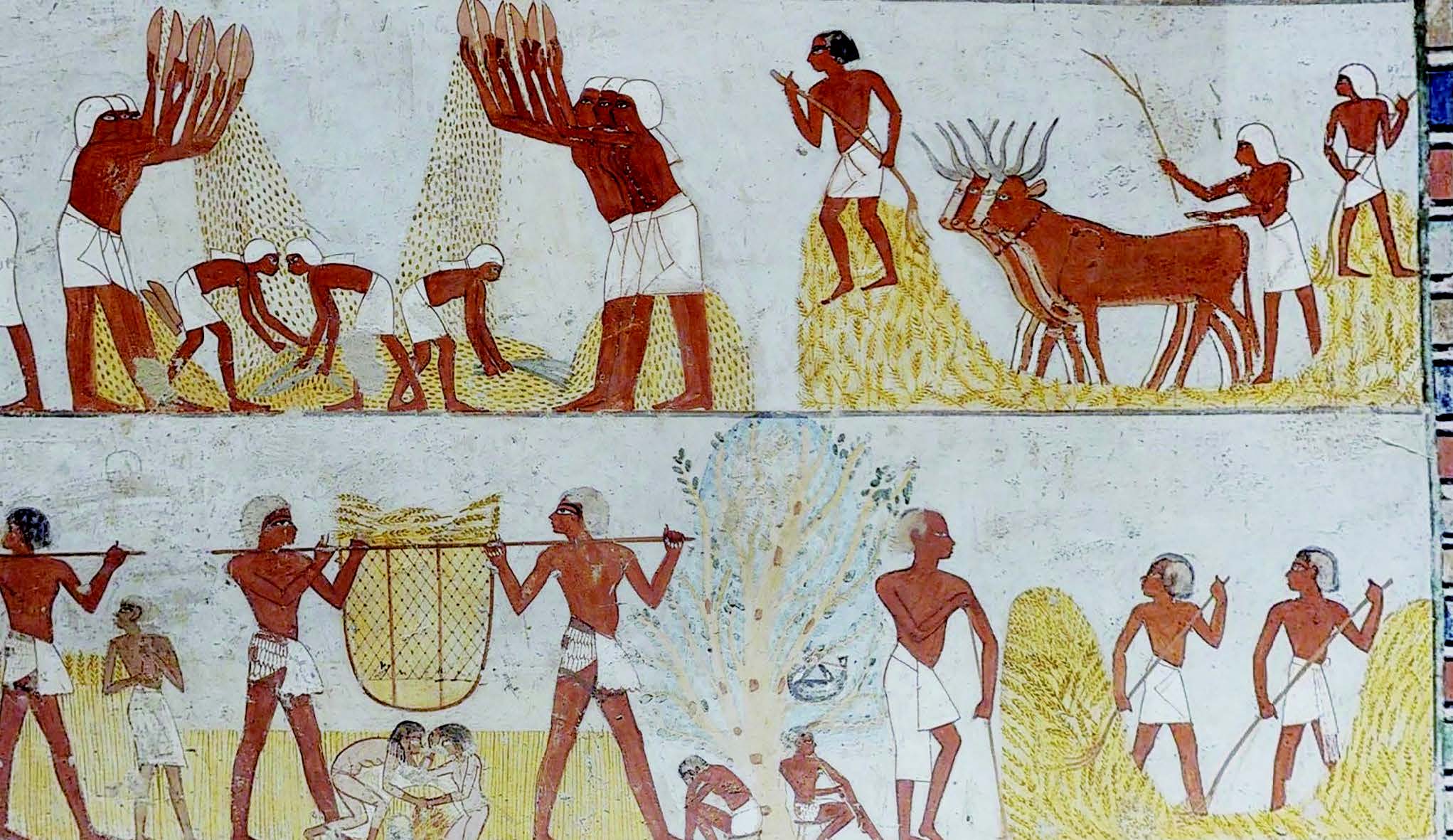 BC 1400년경 이집트 신왕국 시대, 테베의 아몬 대신전 서기관이자 신전에 속한 농토의 경작과 수확을 관리하는감독관 메나(Menna)의 무덤 벽화(이집트 테베 네크로폴리스)