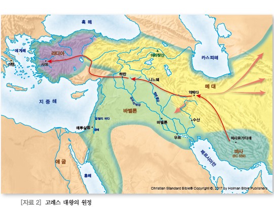 [자료 2] 지도에서 노란색으로 표시된 곳은 성경에 메대라고 기록된 메디아 왕국입니다. 메대는 앗수르 제국의 속국이었으나, BC 612년에 바벨론과 함께 앗수르의 수도 니느웨를 함락시켰습니다. 성경에 고레스라고 기록된 키루스 2세는 메대 왕국의 속국이었던 이 파르스 지방의 왕 캄비세스 1세와 메대 공주 만다네 사이에서 태어났습니다.