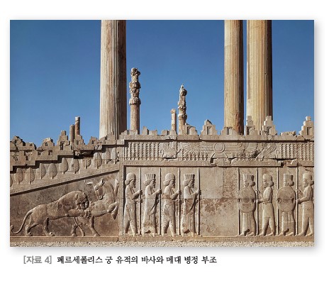 이러한 역사는 현재 이란에 위치한 페르세폴리스 궁전 외벽의 부조 장식에도 잘 나타나 있습니다. 유적에는 둥근 모자를 쓴 메대 병정의 모습과, 각진 모자를 쓴 바사 병정의 모습이 함께 나타나 있습니다.