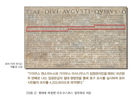 지금 ‘아우구스투스의 업적록’의 전문이 담긴 비석이 온전히 남아 있는 것은 없습니다. 이탈리아 로마의 박물관에는 각지에 남은 파편들을 모아 만든 복원본이 전시되어 있는데, [자료 2] 이 비문에는 BC 8년경에 집정관급의 절대 명령권을 통해 호구 조사를 실시했고, 이를 통해 로마 시민의 숫자는 423만 3천 명으로 파악했다는 내용이 새겨져 있습니다. 당시 인구 조사는 매우 어려운 일이었지만, 식민지에 있는 인구 숫자를 파악하면 세금을 그만큼 정확하게 걷을 수 있고, 세수를 예측하면 재정을 계획하기가 쉽기 때문에 체계적으로 인구를 조사했습니다. 이때 남자는 14세부터 65세까지, 여자는 12세부터 65세까지 매년 그 숫자를 조사하여 그 사람 수대로 세금을 거두었다는 것이 실제 역사 기록으로 남아 있습니다.