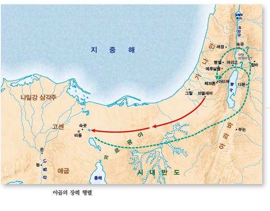 창세기 50장에는 야곱의 죽음과 장례에 대한 내용이 기록되어 있다. 야곱은 아들들에게 자신이 죽으면 아브라함이 헷 사람 에브론에게서 산 마므레 앞 막벨라 밭의 굴에 장사지낼 것을 명했다. 창 49:29-30 참조 야곱과 그 가족들이 정착한 고센 땅에서 마므레까지는 직