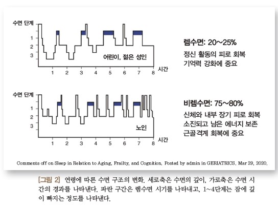 어린이와 성인, 노인은 각각 수면 패턴에 차이가 있다. 어린이와 성인의 경우 비렘수면에서 시작해 점차 깊은 잠에 들어갔다가 렘수면으로 돌아오기를 반복하는 데 비해 노인의 경우 깊은 잠으로 들어가기까지 시간이 오래 걸리고 깊은 잠에 들어도 잘 유지되지 않으며 렘수면 주기도 불규칙하다.