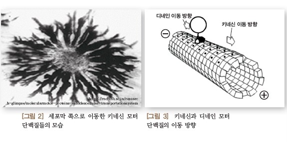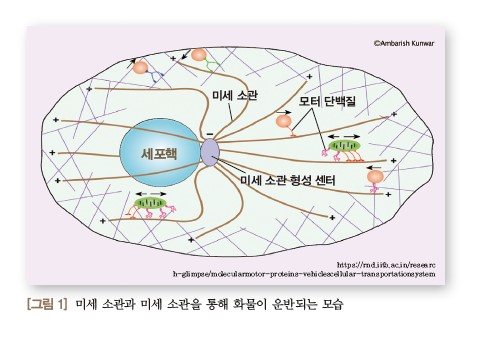 키네신이나 디네인 같은 모터 단백질은 세포 골격 속에 있는 ‘미세 소관’이라는 아주 미세한 관을 통해 여러 물질을 한 방향으로 목적지까지 운반한다. 세포의 고속도로 시스템이라고 할 수 있는 미세 소관은 튜불린이라는 단백질로 만들어진 지름 25㎚의 관으로, 세포의 중심부부터 가장자리, 즉 세포막까지 뻗어 있