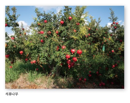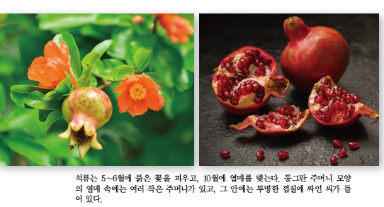 석류는 높이 2~7m의 키가 작은 낙엽 교목으로, 우리나라 남부 지방에서 주로 자란다. 식용이나 약용으로 사용되었고, 열매 안에 많은 종자가 들어 있기 때문에 예로부터 다산의 상징으로 쓰였다. 전통 혼례복인 활옷이나 원삼에도 자손을 많이 낳으라는 의미를 담아 석류나 포도 등의 문양을 넣었다.