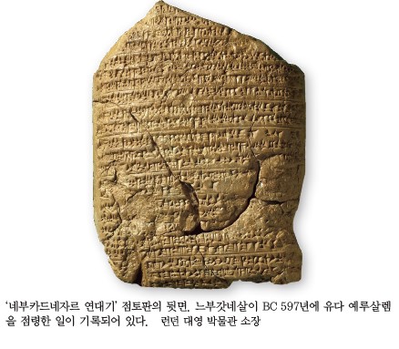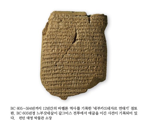 기원전 6세기경 아시리아(앗수르)를 멸망시키고 메소포타미아를 장악한 새로운 제국 바빌로니아(바벨론) 또한 무수한 점토판 기록물을 남겼다. 바벨론성 유적이 발견되면서 발굴된 점토판들 중에는 느부갓네살왕의 연대기가 있는데, ‘네부카드네자르 연대기’라고 불리는 이 토판에는 느부갓네살이 왕위를 물려받은 BC 605년경부터 12년간의 역사가 기록되어 있다. 그 연대기의 내용 중에는 구약성경의 기록과 일치하는 것이 있다.