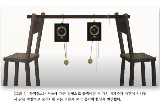 이와 같이 독립적으로 활동하는 물체나 유기물들이 상호 작용을 하기 시작하면 동기화가 일어난다. 동기화의 예로 시계추 여러 개를 한곳에 매달아 놓았을 때 각 방향으로 움직이던 시계추가 점차 같은 방향으로 움직이게 되는 것이나, 메트로놈 여러 대를 늘어놓고 각각 작동시키더라도 결국 똑같은 방향으로 움직이게 되는 현상을 들 수 있다.