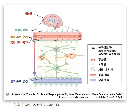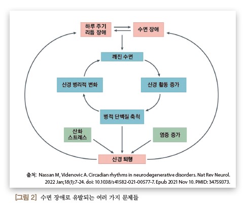 이렇게 노폐물을 배출하는 과정은 밤에 잠을 잘 때만 일어난다. 그런데 수면이 부족하면 노폐물이 제대로 배출되지 않아 뇌에 쌓이게 되고, 뇌세포 사이에 쌓인 노폐물 단백질들로 인해 신호 전달에 문제가 생기면 알츠하이머와 같은 신경 퇴행성 질환으로 이어질 수 있다. 하루 주기 리듬이 깨져 잠을 제대로 자지 못하고 신경 세포들이 쉬지 못하면 뇌에 노폐물들이 많이 쌓여 신경 세포들이 변질되는 악순환으로 이어지는 것이다. 여기서 추가적으로 염증 반